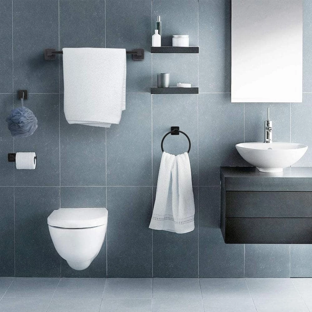 4-Piece Bathroom Hardware Set in Stainless Steel Black. Thickened SUS304 Stainless Steel Black Bathroom Accessories Set Include 17 in. Bathroom Towel Rack, Towel Ring, Toilet Paper Holder and Robe Hook. Complete bath hardware upgrade, perfect for any bathroom, kitchen, bathroom, living room.