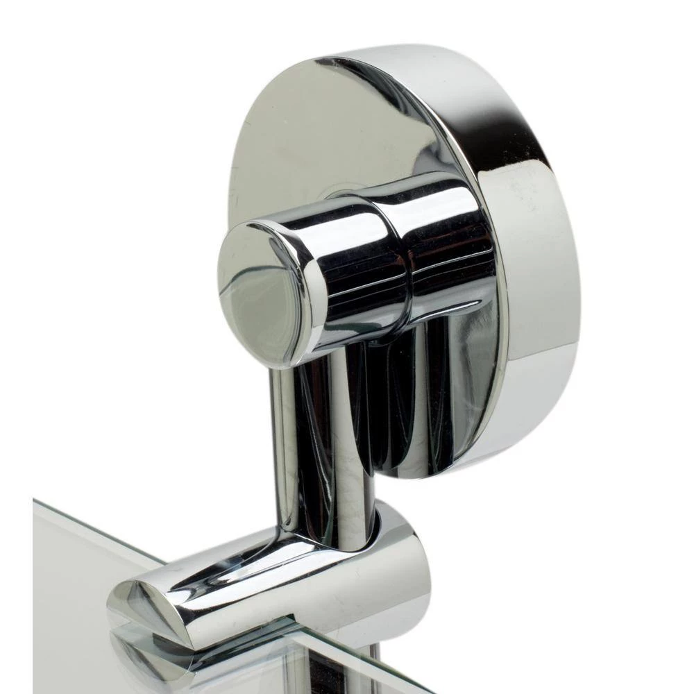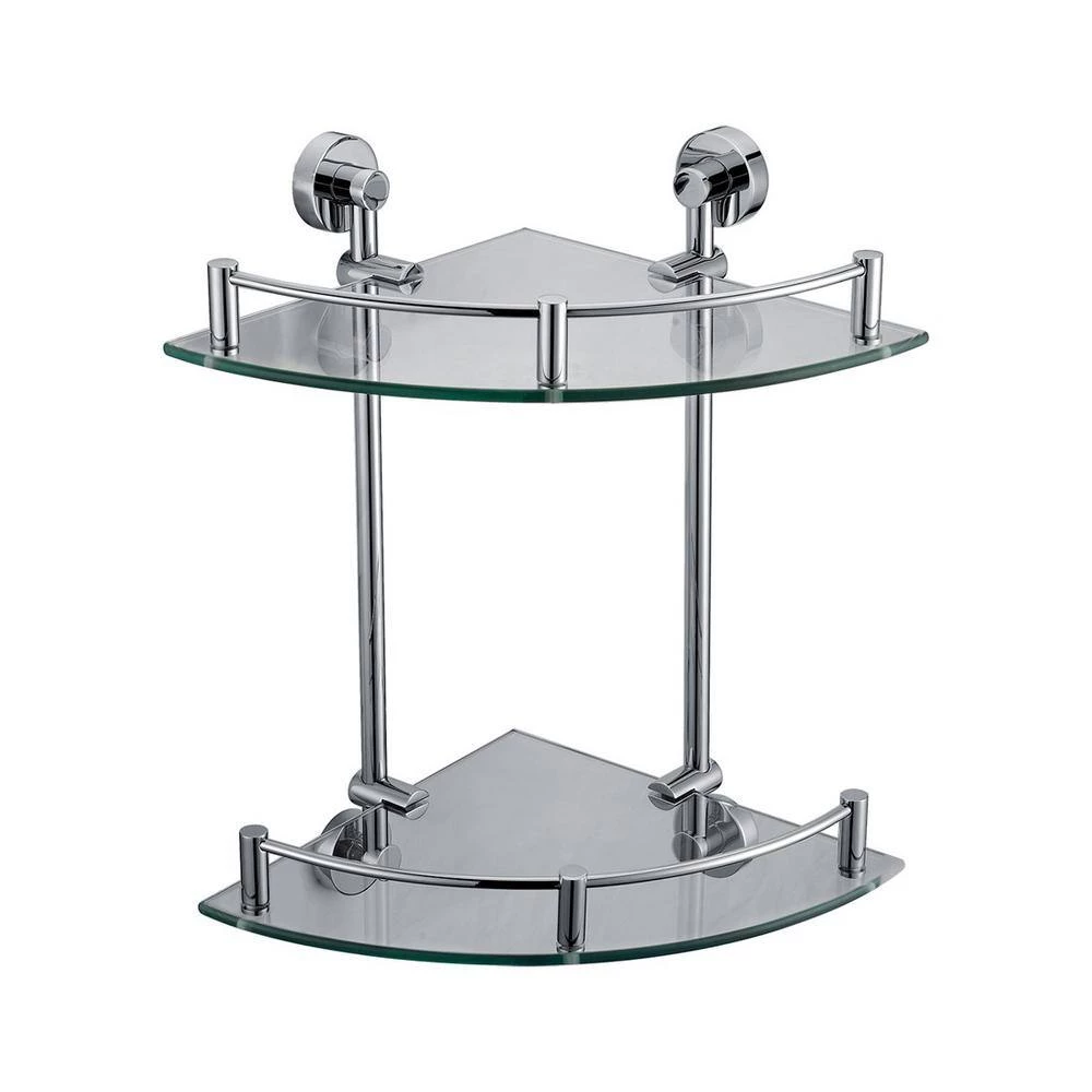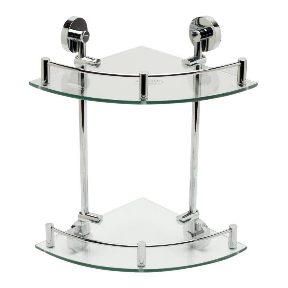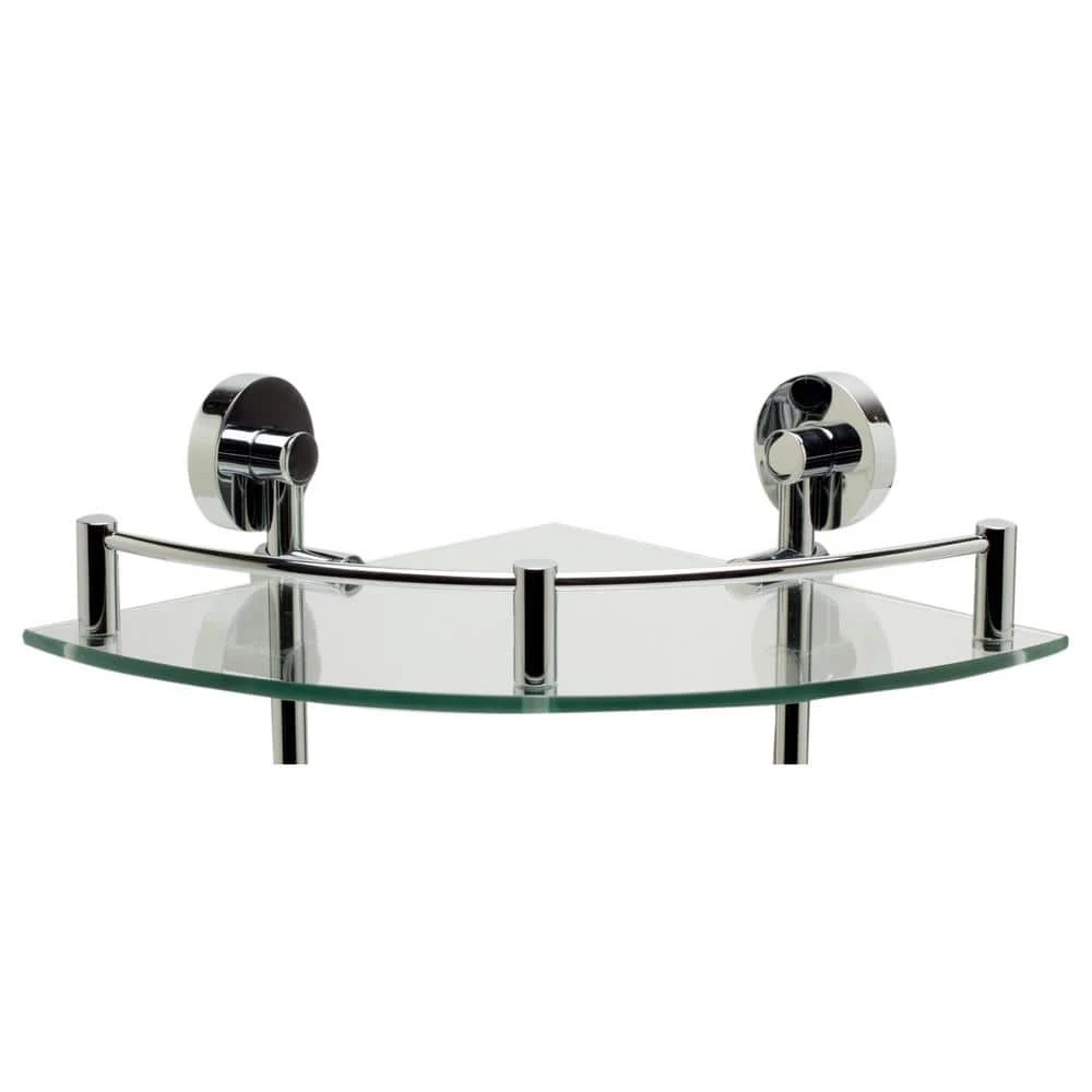 - Includes 2-rounded clear glass shelves with chrome accents on 1-corner mounted unit