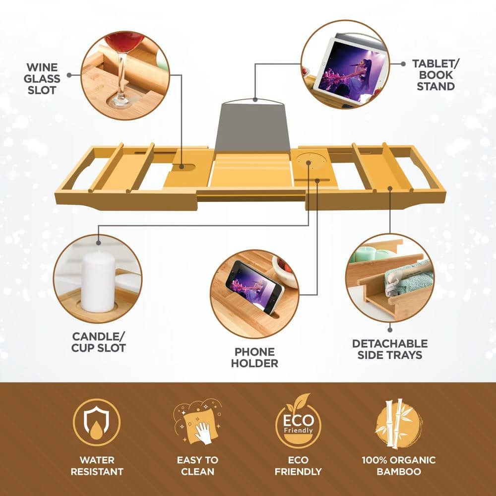 - Enjoy spa luxury bath with a glass of wine – we know you love relaxing in the bath with a book and glass of wine, so we’ve built it with that in mind, our bathtub caddy tray features 2-side trays with accessory slots including wine glass slot, cell phone tray, candle or cup slot and book/tablet holder to give you a 5-star hotel relaxation in the comfort of your home, the trays are detachable and the tablet holder has a removable cover