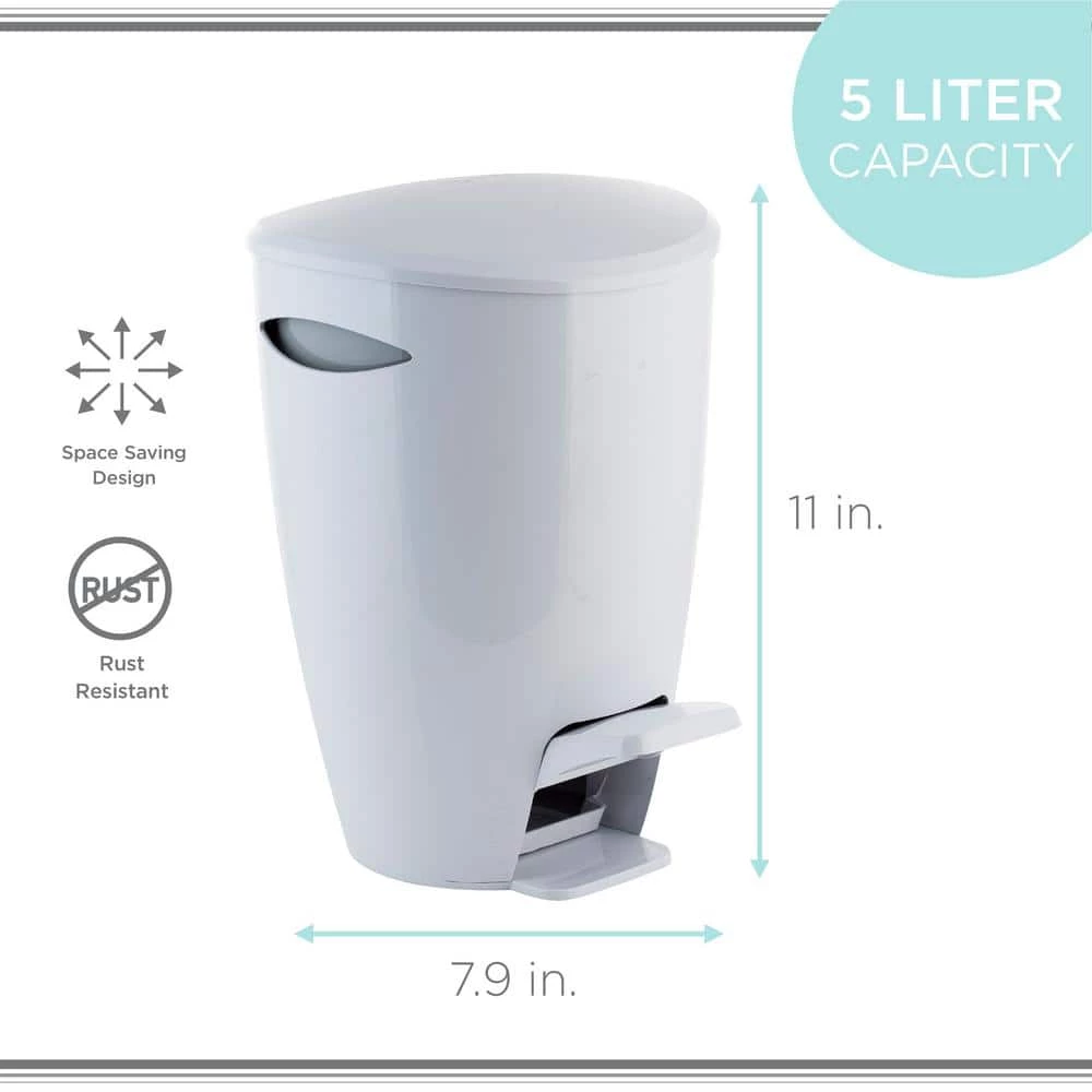 Add a contemporary look to your home with the Bath Bliss 5L Contour Step Pedal Waste Bin. The sleek design makes for a functional and decorative piece for a bathroom, office, or dorm. Designed with a 5-liter capacity and convenient hands-free step pedal for easy opening. The lid traps odors and prevents messes and overflow. A great addition to any small space! Never worry about the look of trash again with this Bath Bliss waste bin to hide the mess. A must have for every room to keep your home clean.