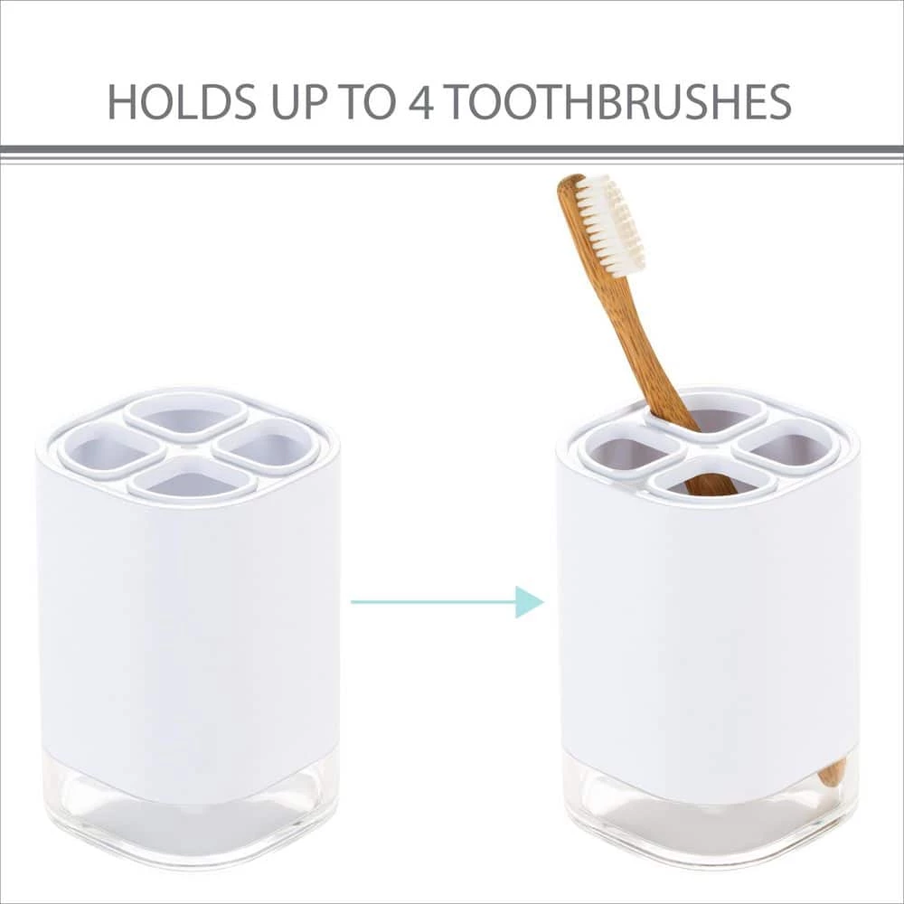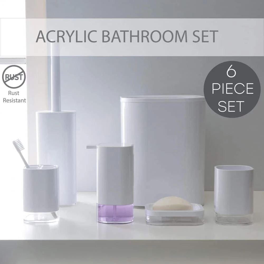 - 6 piece set includes: toilet brush, trash can, soap pump, soap dish, tumbler and toothbrush holder