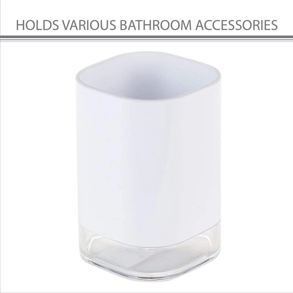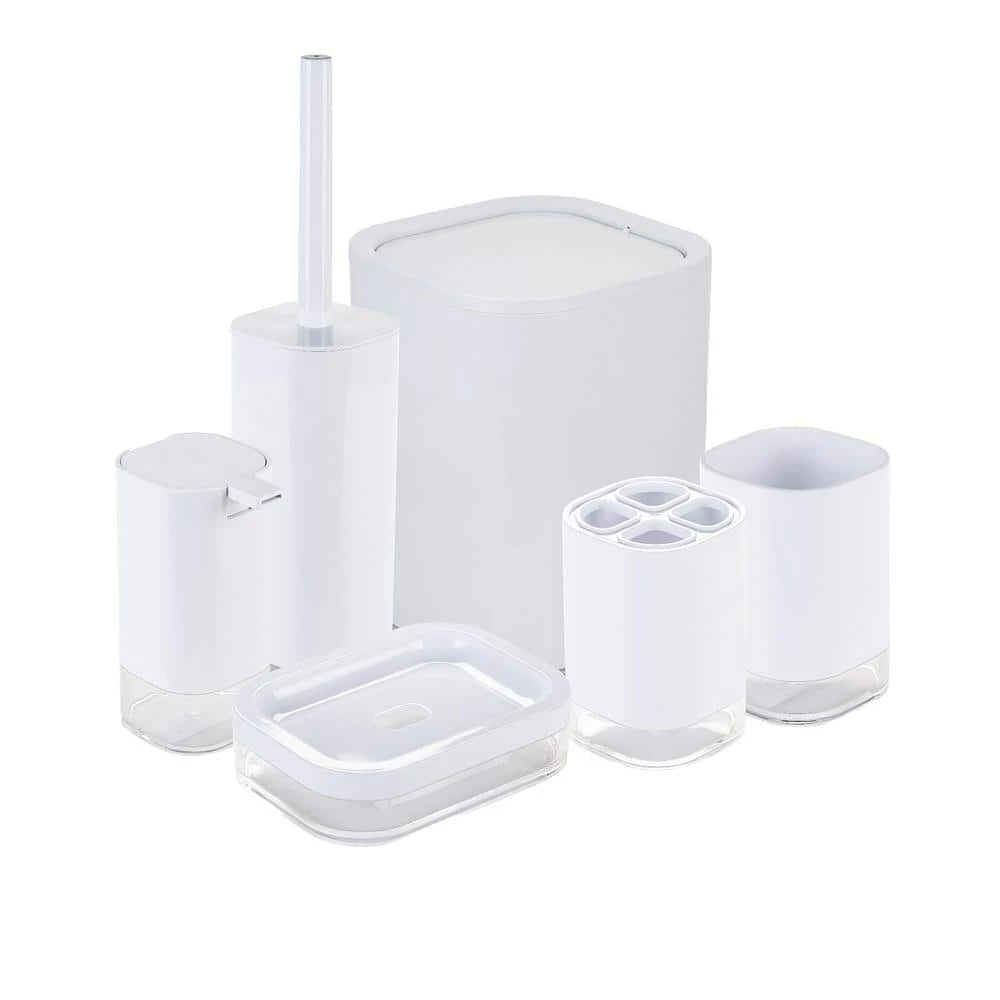 Complete your bathroom with the Bath Bliss 6 piece Bath Ensemble in white. A modern design will give the finishing and functional touch your bathroom needs. The 6 piece set includes a toilet brush, trash can, toothbrush holder, soap dish, tumbler and soap pump. Everything you need in one set!