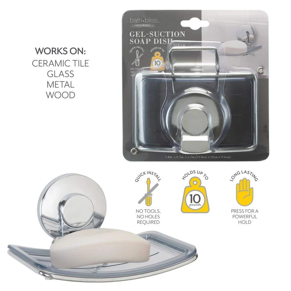 A soap dish you can put in your shower or by your sink, the Bath Bliss gel suction soap dish. A convenient caddy with gel power suction can be placed on any smooth surface. Strong enough to hold up to 10lbs and perfect size for 1 large bar of soap.