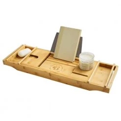 Bambusi Bathtub Caddy Tray with Book and Wine Holder for a Spa Relaxing Bath with Extendable Arms