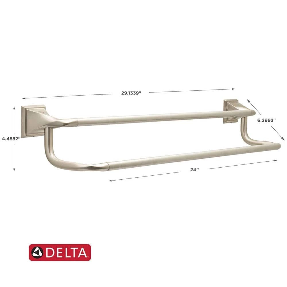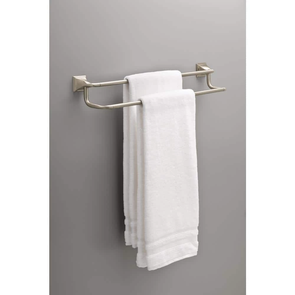 With defined edges and an elegant twist, the Everly Collection has a distinct silhouette to embellish your bath. The square base of the post has a traditional feel while the twist feature adds a modern touch to the collection. This collection is ideal for baths with blended decor styles. The 24 in. double towel bar securely holds all types of towels for bathing convenience. Finish your look today with coordinating pieces from the Everly collection (sold separately).