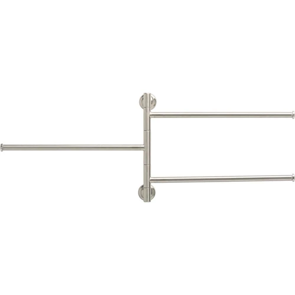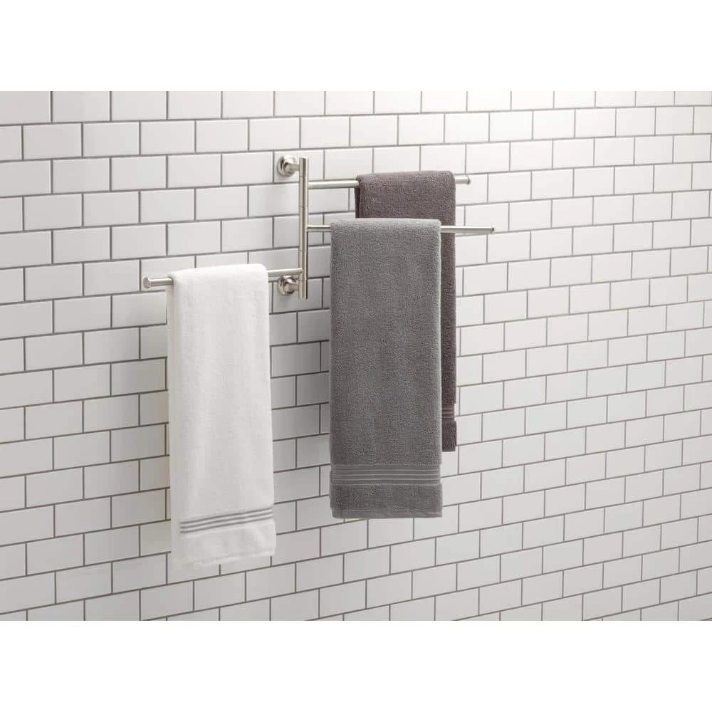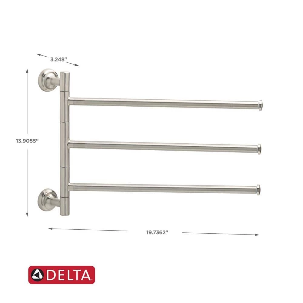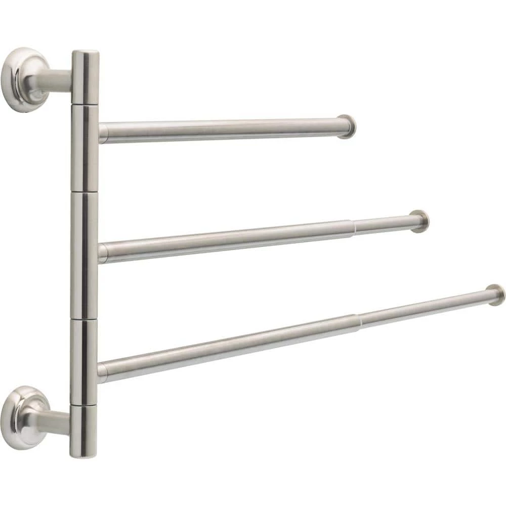 Maximize space where it is needed most with this Delta Pivoting Extendable 3-Arm Towel Bar. The bars pivot 180° to fold against the wall when not in use. When in use, the bars contract to 30 in. in order to allow bath towels to fully dry in between uses. The classic design elements of this product offer an innovative storage solution without sacrificing attractiveness. Engineered for innovation without sacrificing function, the rack allows storage of 3-bath towels. The brushed nickel finish coordinates with Delta brushed nickel bath hardware families. Optimize your space with coordinating extension pieces from Delta.