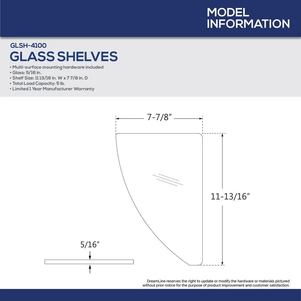 Brighten up your shower space with elegant glass shelves from DreamLine. Durable 5/16 in. thick glass shelf is supported by stainless steel brackets available in 4 finishes to coordinate with any bathroom decor. The discreet mounting hardware allows for quick installation to glass, tile, or drywall. Choose DreamLine for the ultimate solution for your shower project.
