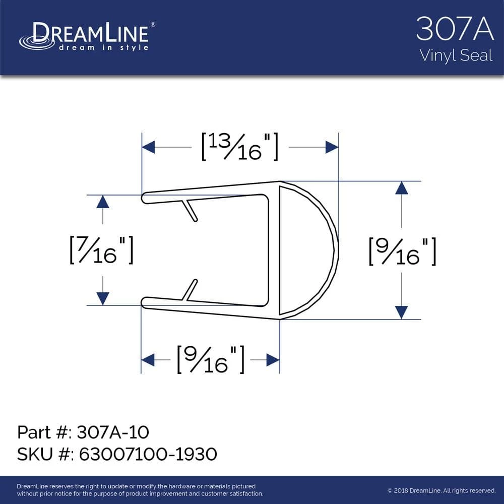 DreamLine Bumper Seal (Part #307A-10). Will replace worn or damaged vinyl and help ensure water splashes are contained. Manufactured to fit all DreamLine Mirage-X, Enigma-Z, Enigma-X, Enigma Air, Mirage doors.