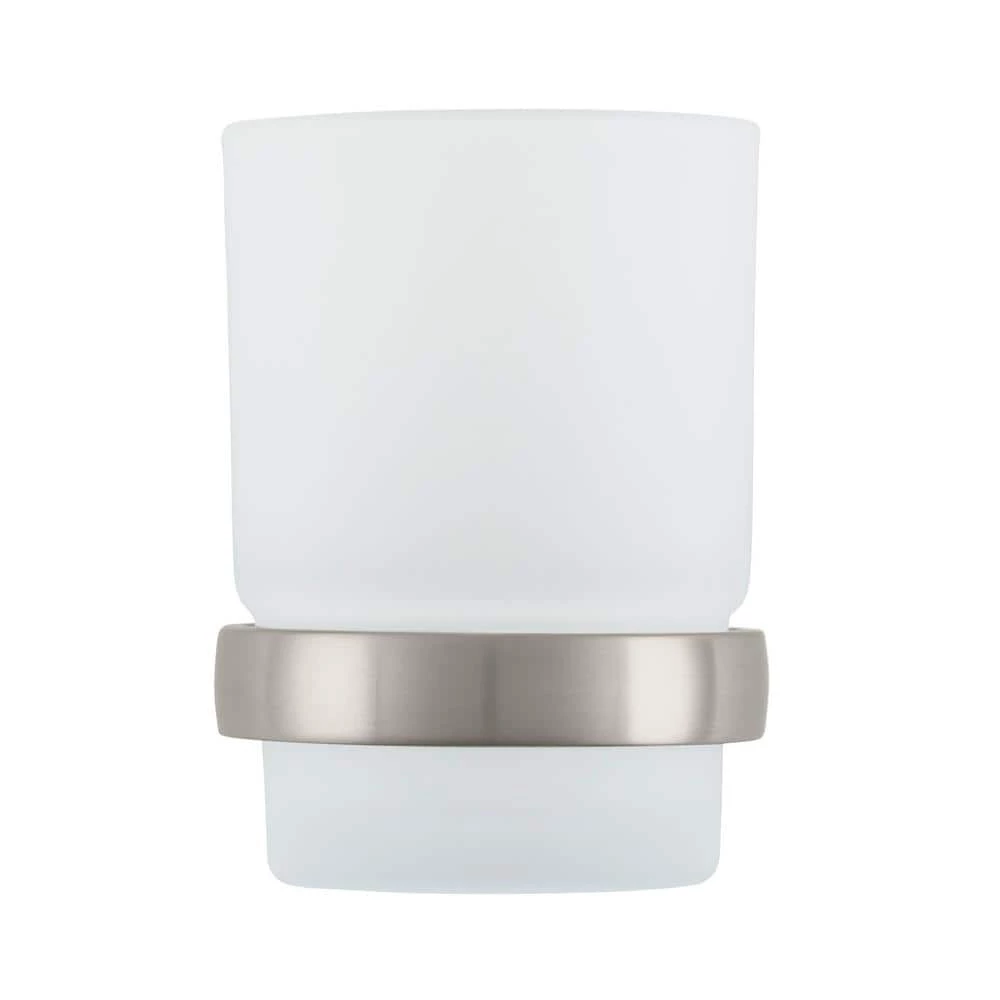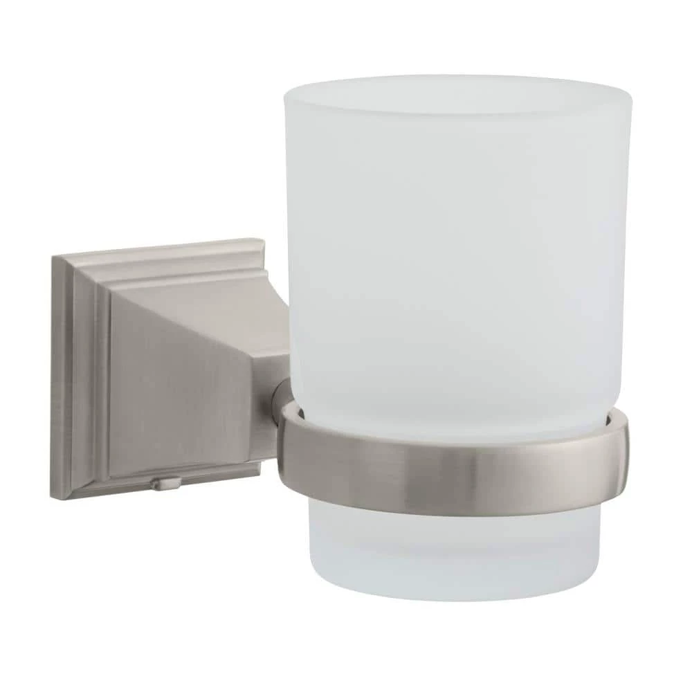 This Glacier Bay Exhibit Wall-Mounted Tumbler Holder in Brushed Nickel pairs glass with a luxurious brushed-nickel finish for a distinguished statement in your bathroom. This 6.74 oz. capacity tumbler holder coordinates with other pieces from the Glacier Bay Exhibit collection for your matching convenience.