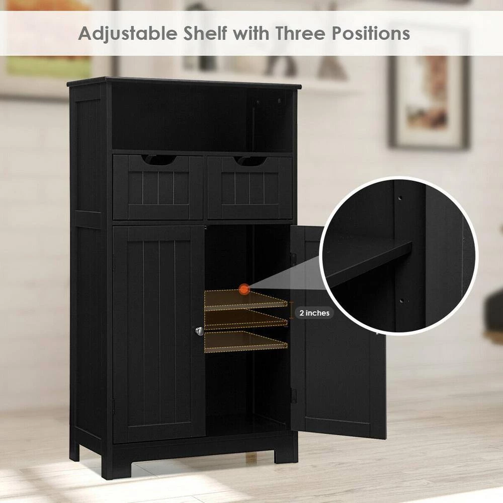 This floor cabinet is a perfect space saving cabinet for your home! Divided into 3 parts, the cabinet can be used to store and classify lots of items. It is great to store some things in open part for convenient taking. 2 drawers can be adjusted in different positions according to your needs. And the lower cabinet is divided into 2-layers with a removable shelf. In addition, the door is equipped with magnetic button to prevent items from falling and round handle for opening and closing easily. This multipurpose cabinet not only can be used in bathroom, but also can be placed in your bedroom, living room and kitchen to be a free-standing organizer. Its stylish design makes this cabinet match well with any other home furniture or decors.