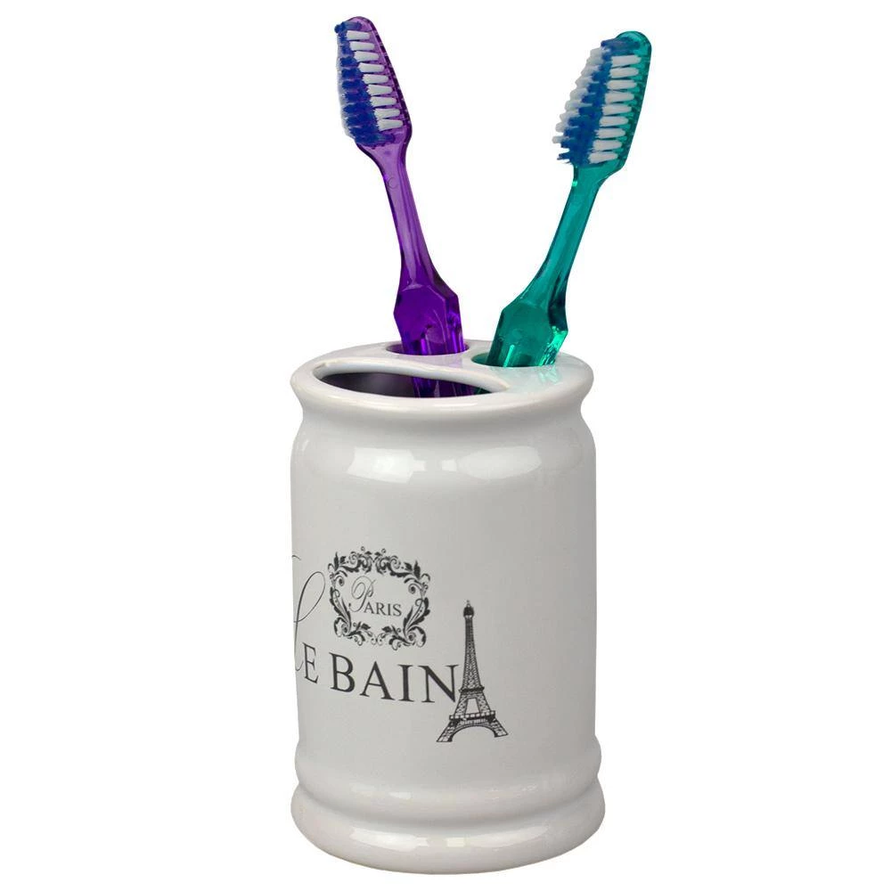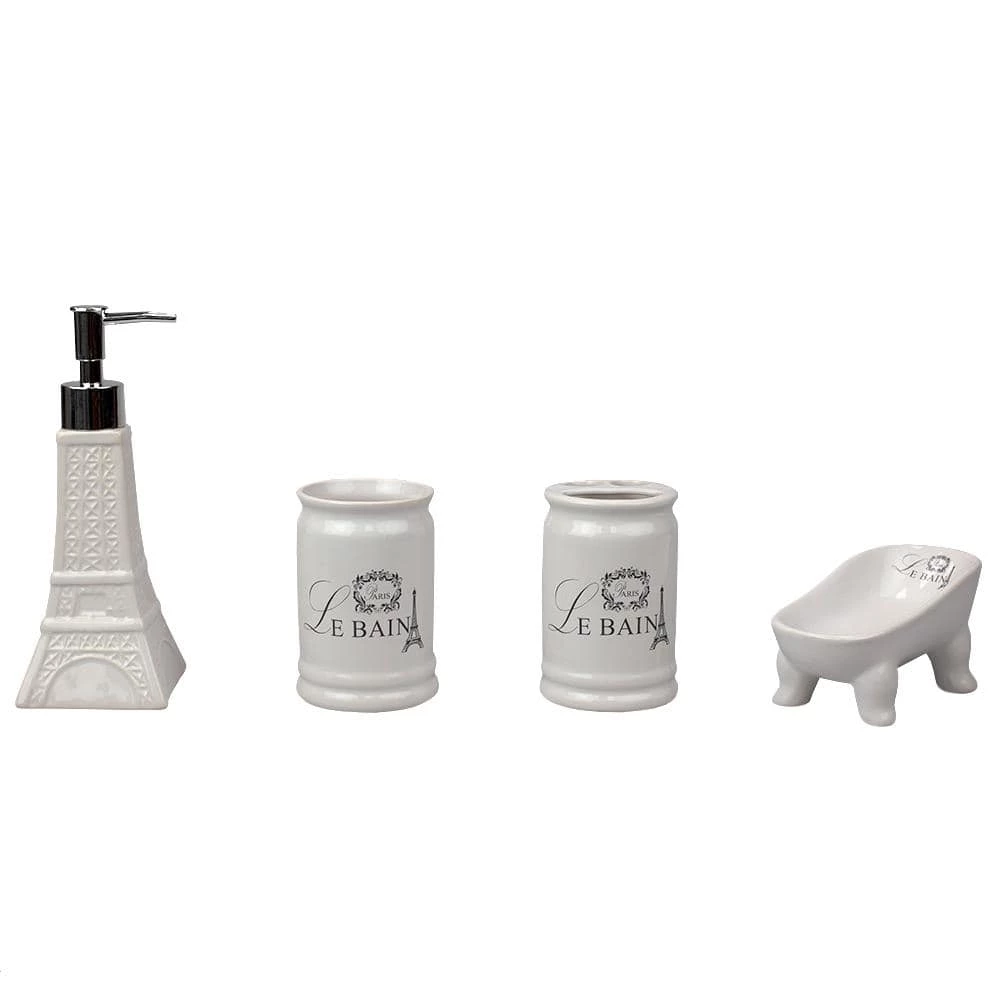 - Refresh your bathroom with a touch of old world Parisian charm using this 4-piece bath accessory set the set comes complete with a Eiffel tower designed lotion/soap dispenser, an adorable tub shaped soap tray, and matching bathroom tumbler and toothbrush holder great for the guest bath to equip your guests with all the accessories to breeze through their routine perfect for dressing up the master bath or office restroom with a classy French touch