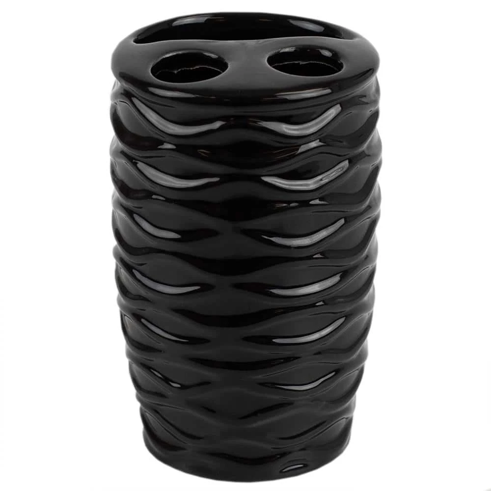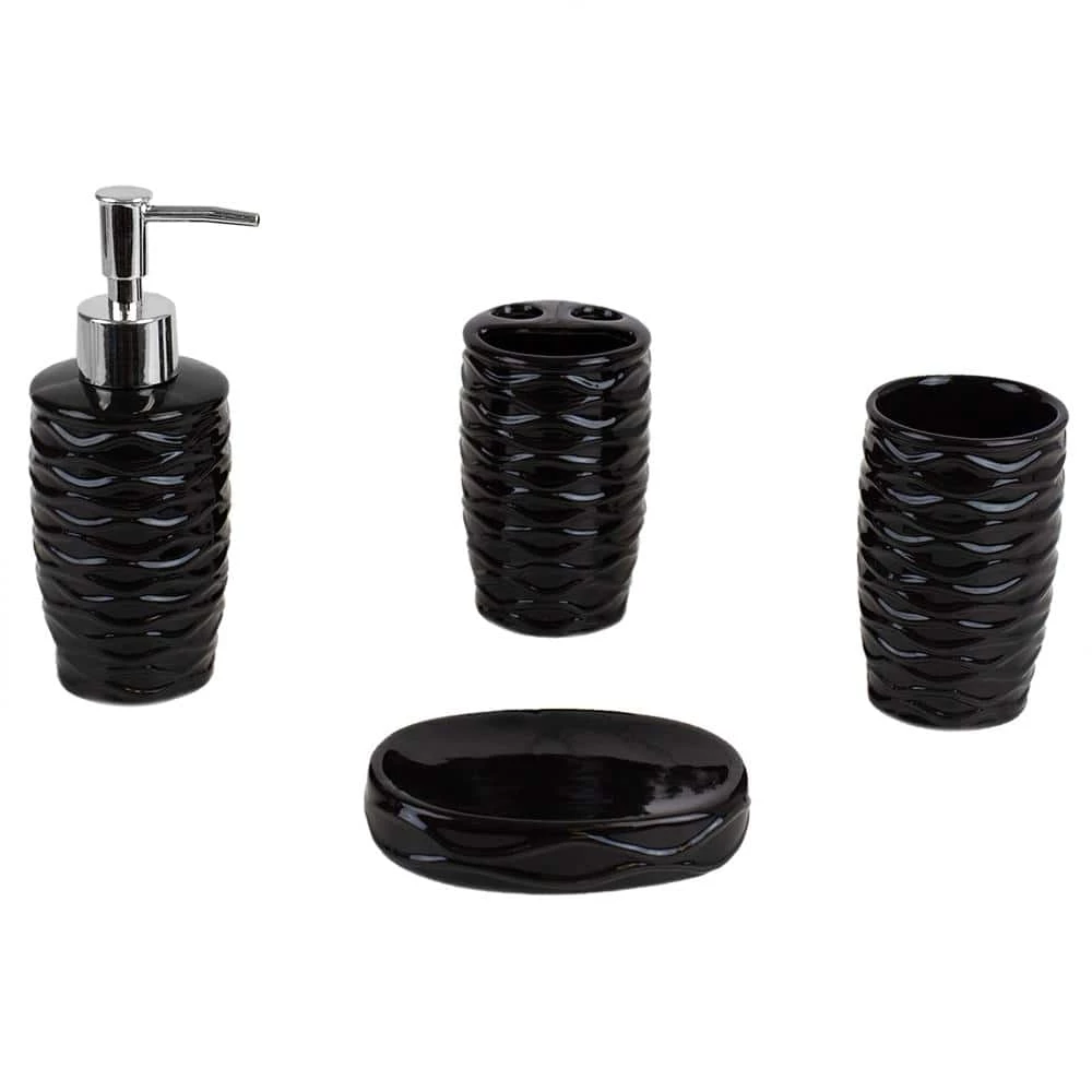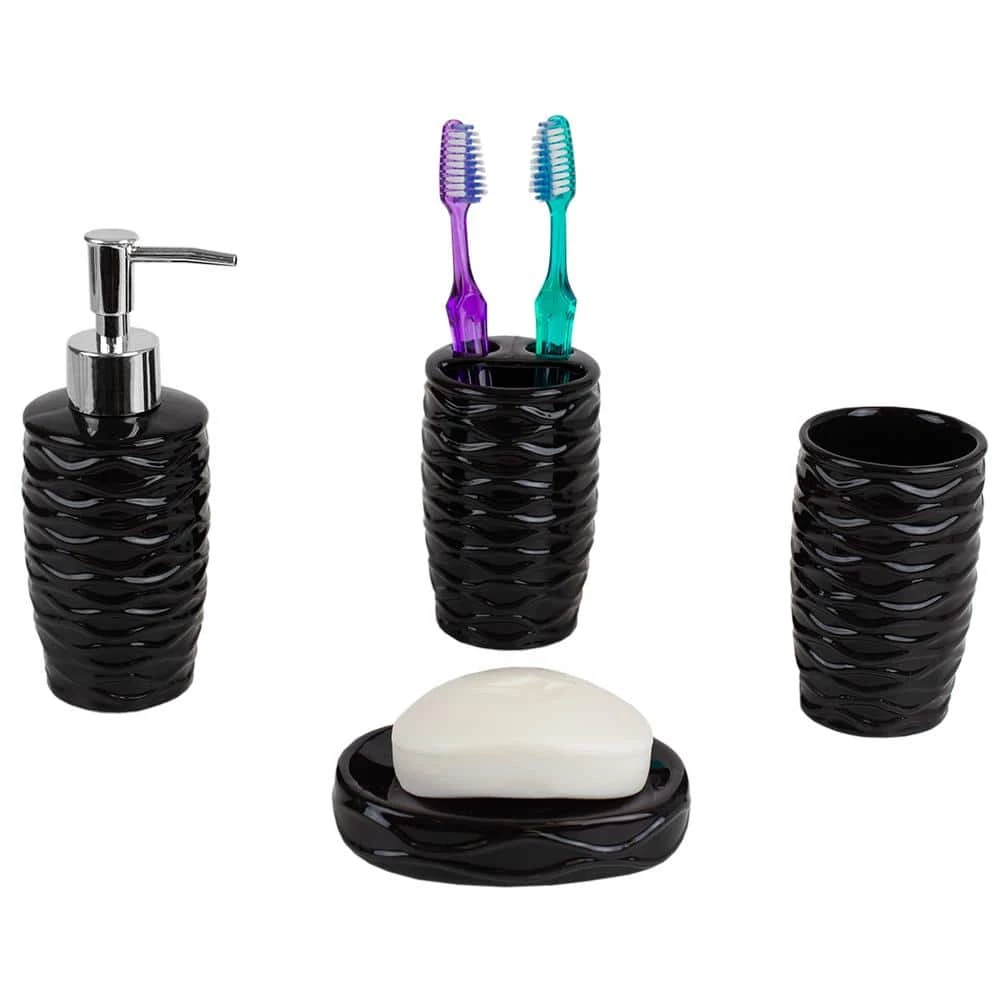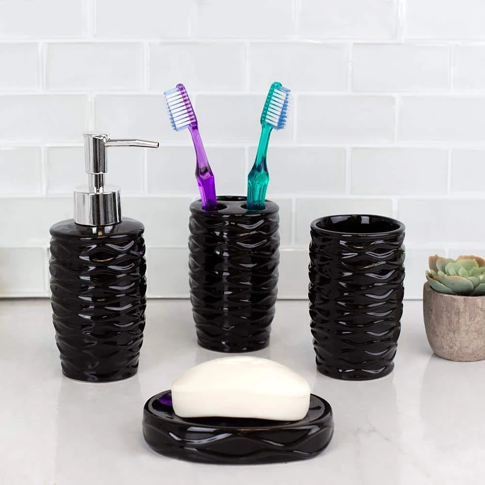 - 4-piece bathroom accessory set adds style and function to the counter or vanity with its durable ceramic material and elegant curve detailing