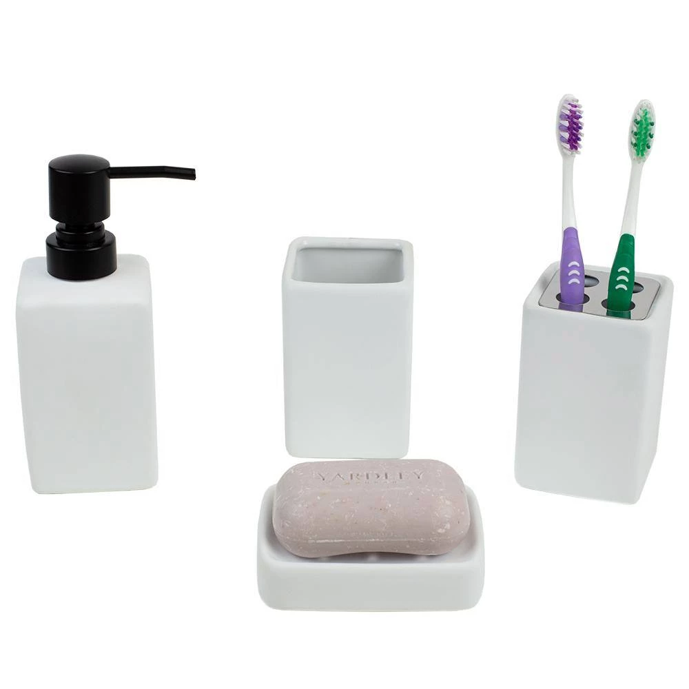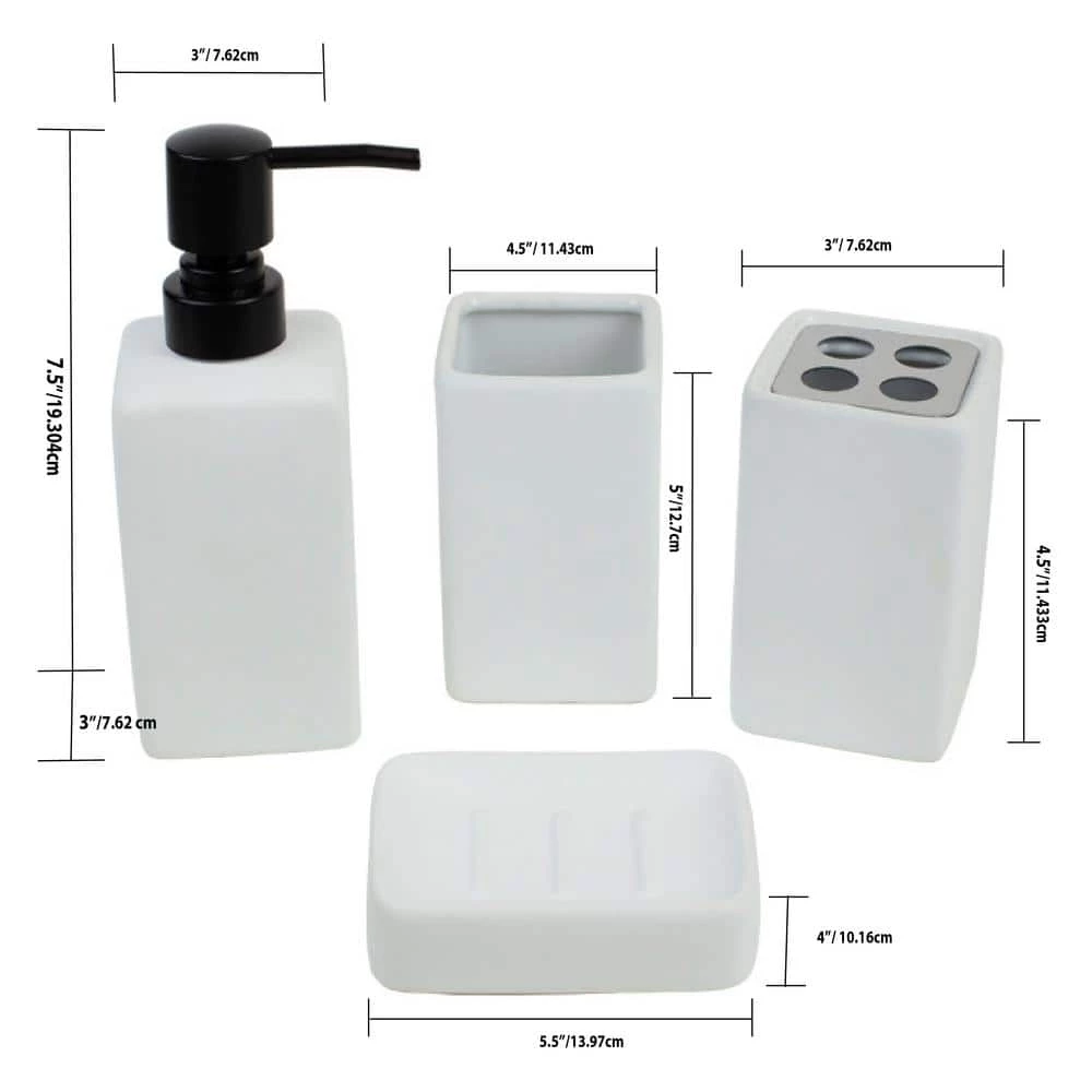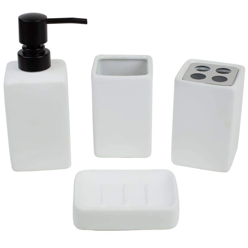- Fully functional 4 piece bath ensemble: 4 piece bathroom accessory set adds style and function to the counter or vanity with its durable ceramic material and timeless design