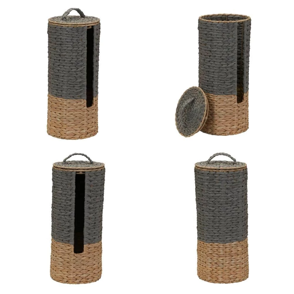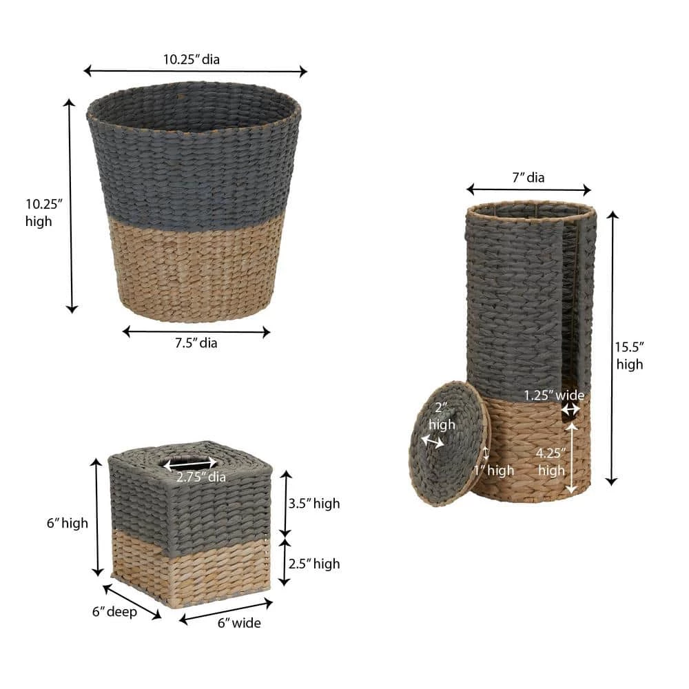 Give your bathroom a rejuvenated look that is both fresh and classic with this collection of wicker bathroom accessories. This 3-piece set includes a standing toilet paper holder, a tissue box cover, and a wastebasket all made from matching, natural cattail and paper wicker with gray accents. The components are soft to the touch, but the toilet paper and tissue box holders are reinforced with wire to maintain their shape. All items are lightweight, sturdy and easily cleaned with nothing more than a clean, dry cloth. And with their traditional and natural color scheme, the set fits perfectly with virtually any classic bathroom decor or theme. The tissue box cover measures 6 in. in all directions (a perfect size for standard boxes of tissues). The toilet paper holder measures 15.5 in. height and 7 in. Dia, making it large enough to stack up to three rolls of standard or mega-sized toilet paper with ease. The wastebasket stands 10.25 in. tall with a diameter of 12.25 in. and could even serve as a fashionable planter cover when paired with a flower pot of a similar size and shape (the basket itself is not water resistant). This 3-piece set of wicker bathroom accessories is an excellent starting point.