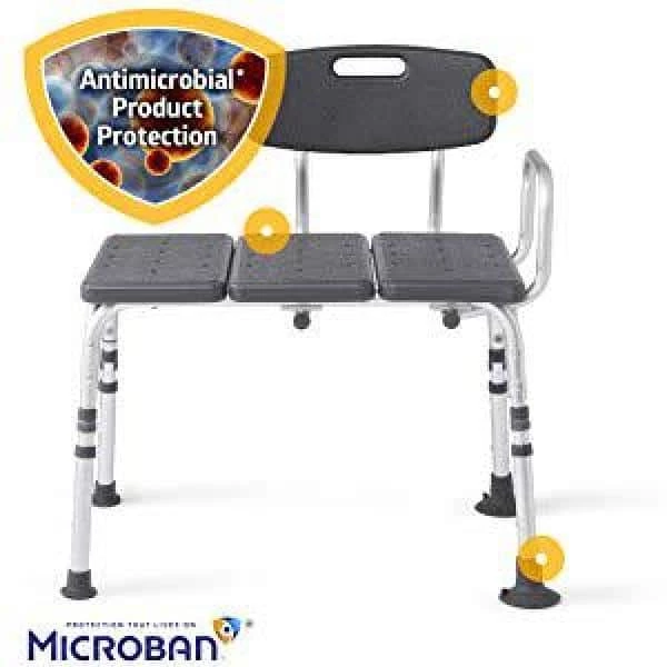 This transfer bench has the design and functionality that makes it perfect for anyone with arthritis, bending or stretching limitations, and for those with a recent knee or hip surgery. It comes with quality features like a reversible backrest, non-slip textured seating, armrest for extra stability, and large non-slip suction cup feet for inside the tub. Tool-free assembly and easy pushbutton height adjustment provide great versatility and convenience. To keep your bench fresh and clean longer, built-in antimicrobial protection on non-painted surfaces help fight stain and odor causing germs 24/7.