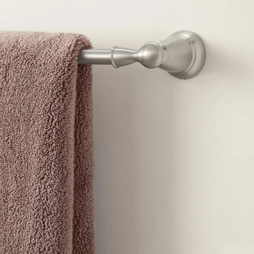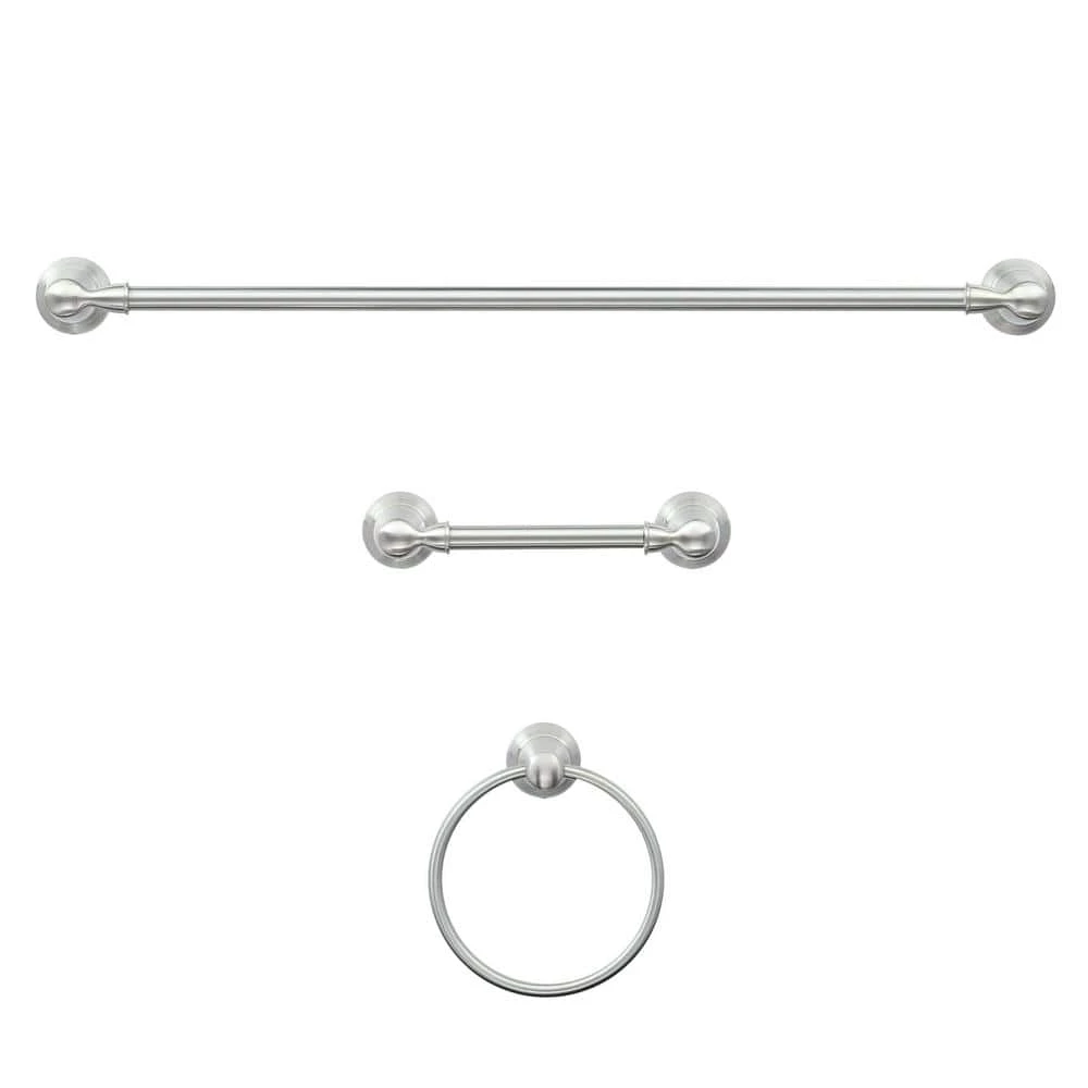 The MOEN Banbury 3-piece kit including a 24 in. towel bar, towel ring, and pivoting paper holder features a Spot Resist Brushed Nickel finish that is resistant to fingerprints and water spots for easy cleaning and long-lasting enjoyment. This Banbury shelf has classic design features to help accent your traditional bath decor. It has an appealing, lightly brushed metallic finish.