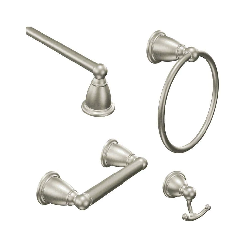 - Includes (1) 24 in. towel bar, (1) toilet paper holder, (1) towel ring, and (1) robe hook
