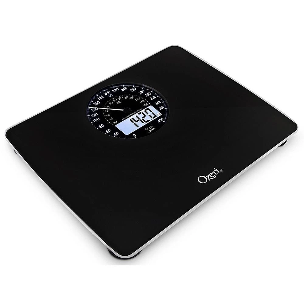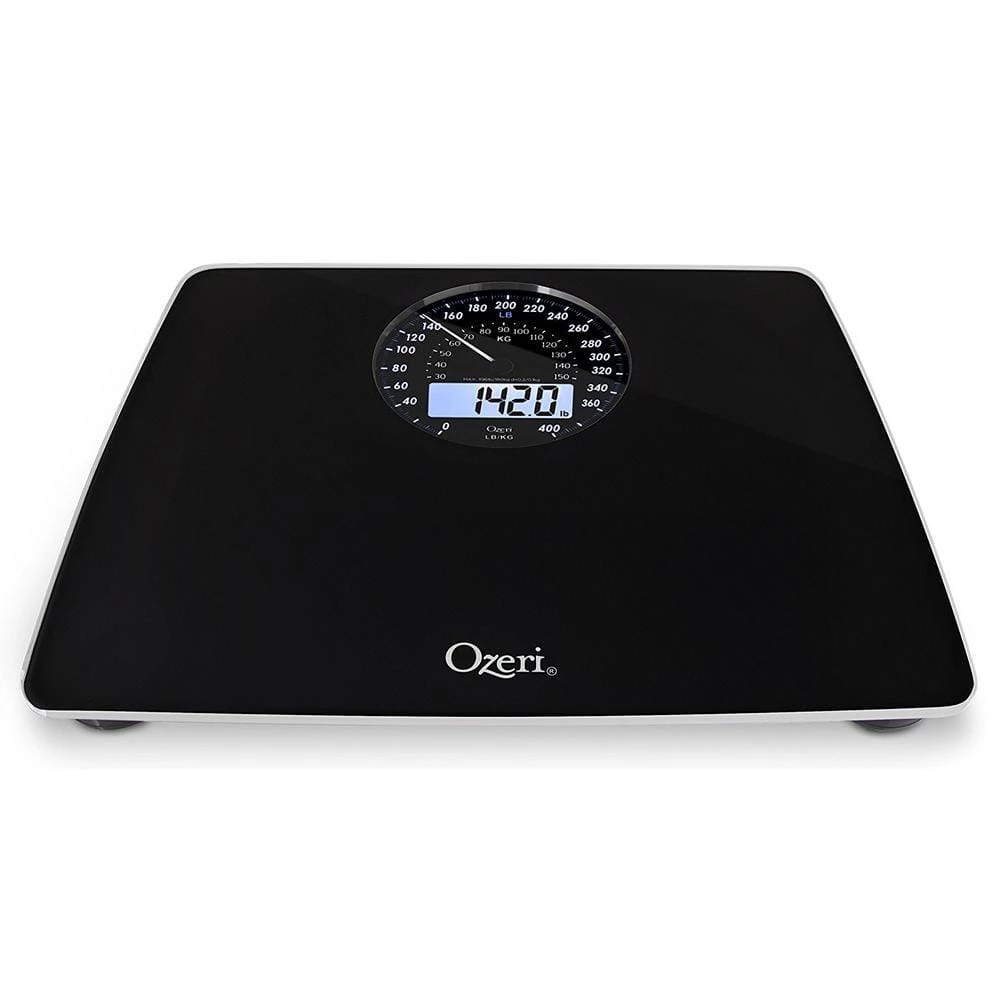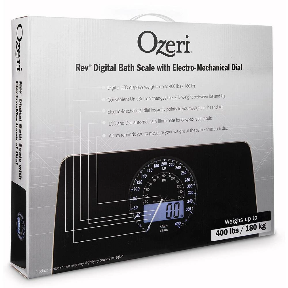 The Ozeri Rev Digital Bathroom Scale with Electro-Mechanical Weight Dial is the world’s first weight scale to incorporate a synchronized electro-mechanical Dial and LCD that automatically illuminate and point to your weight in lbs. and kg, for easy-to read results in all light conditions and from any angle. Boasting a visually arresting design, the Ozeri Rev scale features a huge 5.5 in. mechanical dial display with an integrated digital blue-backlit LCD, accented by stylish chrome to create a distinctive retro look, yet with the accuracy of modern technology. This professional quality scale features an oversized platform made of impact-resistant tempered glass with slip-resistant feet for ideal stability and a new built-in alarm that reminds you to measure your weight at the same time each day. The Ozeri Rev Digital Bathroom Scale uses 4 high precision GX sensors that weigh up to 400 lbs. (180 kg) in 0.2 lbs. or 0.1 kg increments. Whether your goals are weight loss or muscle gain, the Ozeri Rev features the latest generation of StepOn technology to display your precise body weight upon stepping onto the scale, with no tapping required. The Ozeri Rev Digital Bathroom Scale is auto-calibrated and automatically turns off to conserve battery life. It runs on 3 AA batteries (included) and features a Low Battery Indicator. Your Satisfaction is 100% Guaranteed.