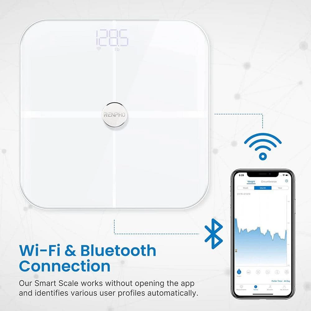 - Easy connection: the RENPHO body fat scale can transfer your body composition data via 2.4 GHz Wi-Fi or Bluetooth version 4.0 and above automatically, you can monitor your body composition at any time and anywhere