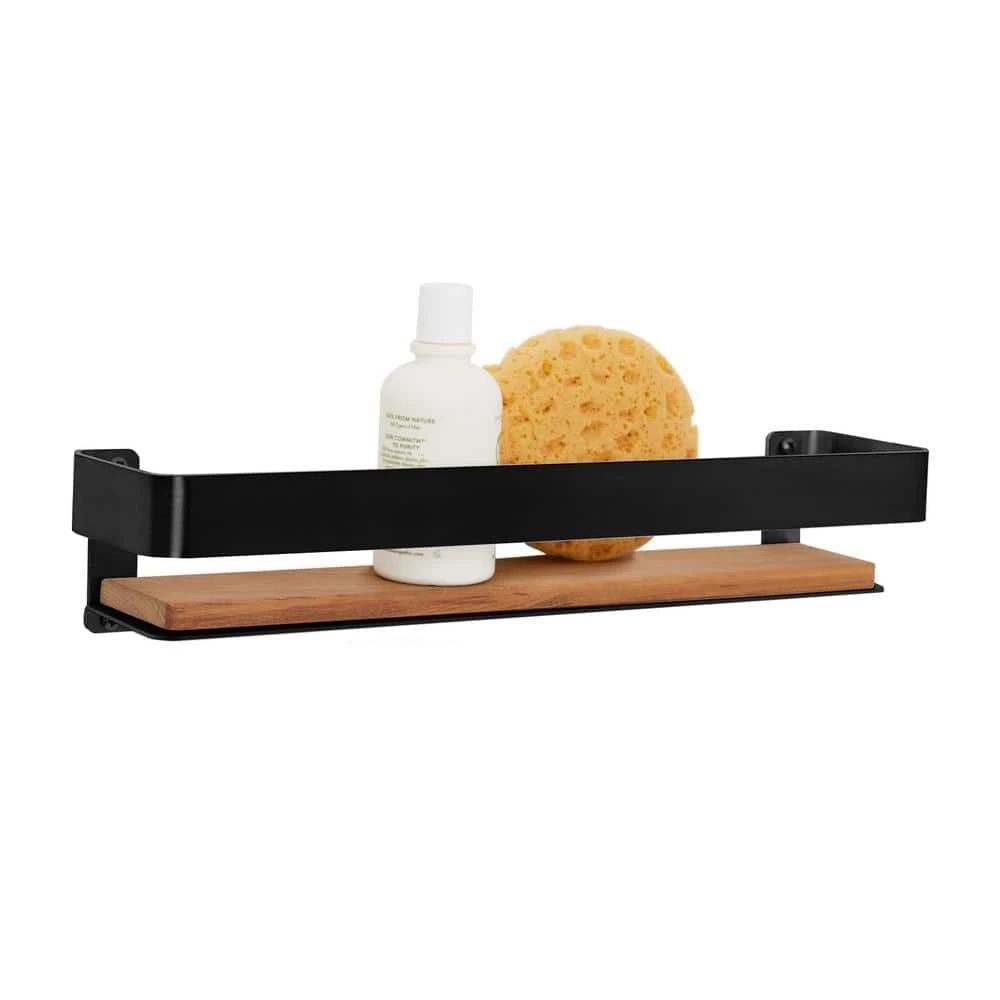 - Dimensions: 18 in. L x 4 in. W x 3.5 in. H, the rectangular shelf has a matte black finish with a natural teak wood insert
