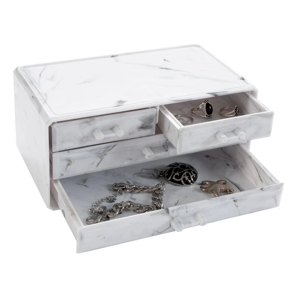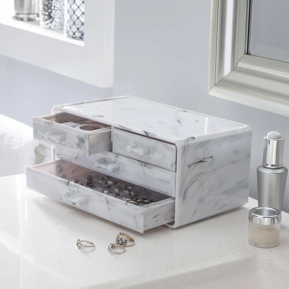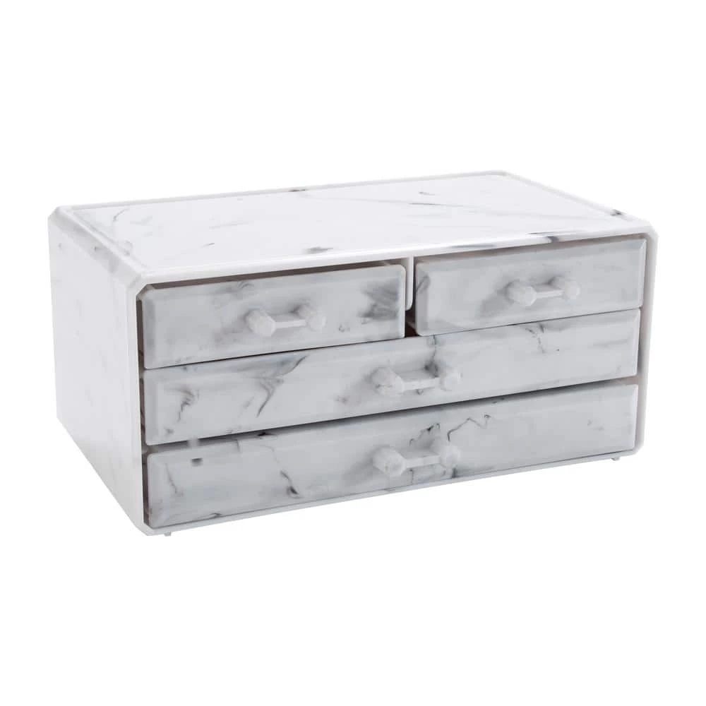 The Simplify 3-tier drawer jewelry organizer with 4-drawers is a helpful accessory to add to a bathroom, vanity, or dresser space. It keeps your cosmetics or accessories organized and within reach, making it simple for you to be ready to go all the time. With its compact size, it can fit a variety of counter spaces nicely and keeps your workspace clean and organized. The 4-drawers are the perfect size for cosmetics or jewelry. The cosmetic organizer is lightweight so you can move it around as often as you want.