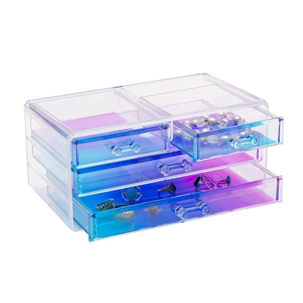 The Simplify 3-tier drawer jewelry organizer with 4-drawers is a helpful accessory to add to a bathroom, vanity, or dresser space. It keeps your cosmetics or accessories organized and within reach, making it simple for you to be ready to go all the time. With its compact size, it can fit a variety of counter spaces nicely and keeps your workspace clean and organized. The 4-drawers are the perfect size for cosmetics or jewelry. The cosmetic organizer is lightweight so you can move it around as often as you want.