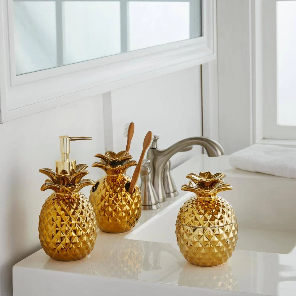 Add a tropical, yet elegant, look to your bath with the Gilded Pineapple Shower Curtain. This sculpted pineapple jar features a gold metallic finish and can be used to hold cotton swabs or other small toiletries. Shop the coordinating Gilded Pineapple collection to complete the look. SKL Home by Saturday Knight Ltd. brings personality, fun and flair to the most intimate spaces in your home with products ranging from bath accessories and shower curtains, to towels, curtains and beyond. Whether your style is upbeat and modern, or classic and cozy, SKL Home provides a look to compliment almost any decor. Combining 40+ years’ experience, global design inspiration and premium fabrications, SKL Home continues to lead the way in home accessories.