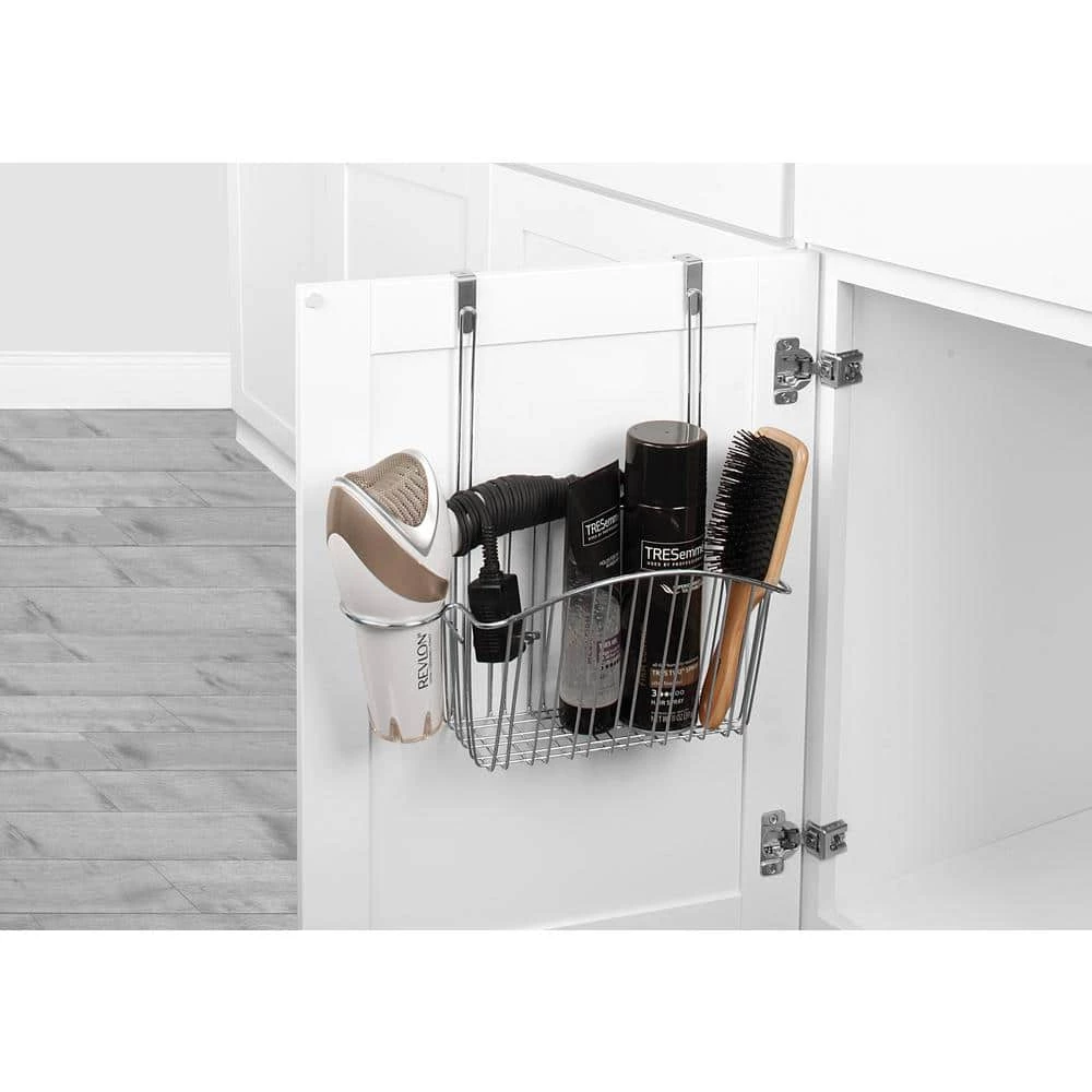 Great for bathroom clutter-control, Spectrum’s Contempo Over the Cabinet Styling Center keeps hair care tools neatly organized. Installation is a breeze: padded brackets easily slide over standard cabinet doors without the need for tools. Ample space allows for storage of hair dryers, flat irons, curling irons and hair brushes. The convenient basket also provides storage space for other hair care accessories. Made of heat-resistant sturdy steel.