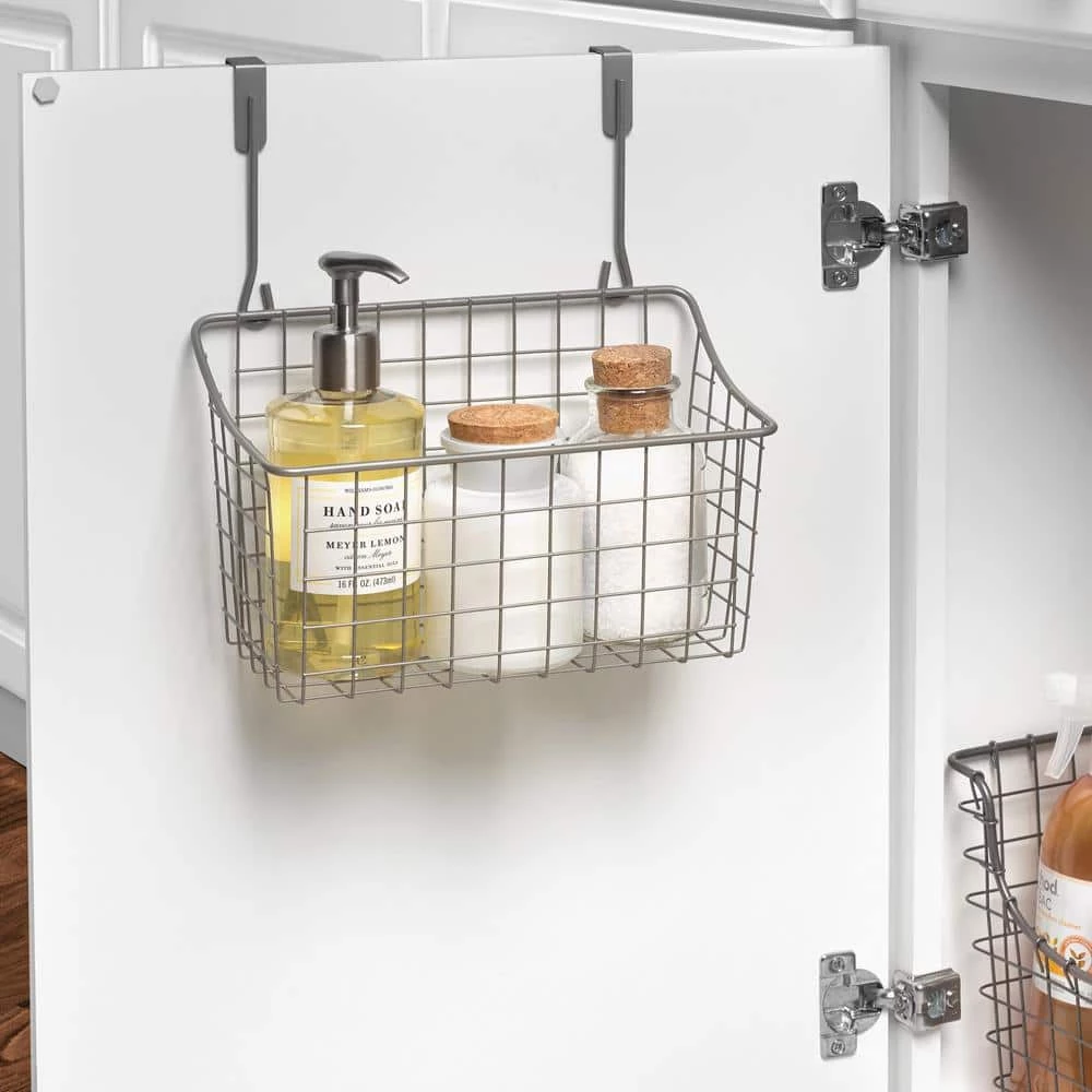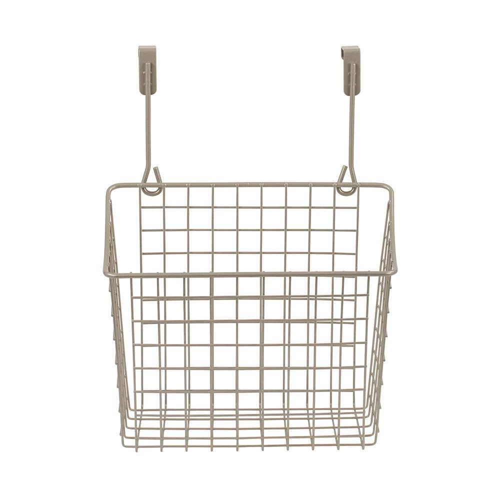 Maximize your bathroom and kitchen storage with the Grid Over-the-Cabinet Storage Basket from Spectrum Diversified. The padded brackets slide over cabinet doors to utilize the open space inside the storage area. Use it in the kitchen to hold extra dishrags, sponges, dish soap, and cleaning supplies. Keep it in the bathroom to store extra soap, shampoo, conditioner, loofahs, makeup and remover, cotton swabs, hair products, styling tools, and candles. The sturdy steel supports a significant amount of weight, and the scooped front makes it easy to pull items out of the basket. Over-the-cabinet brackets are padded to protect your cupboards from scratches. These baskets are ideal for those who do not want to drill into cabinetry. Homeowners, renters, and college students will all benefit from the increased storage capacity and lack of installation.
