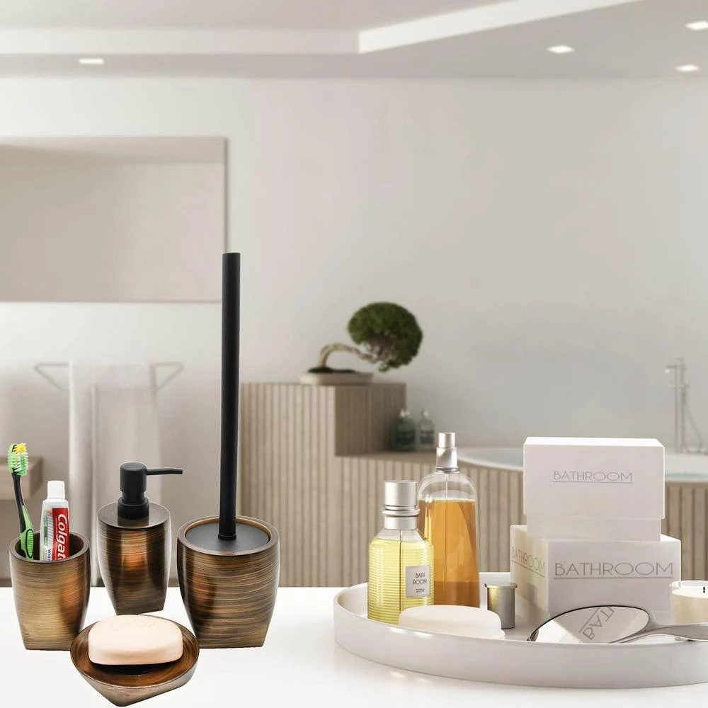 - Complete your bathroom countertops with those accessories featuring a tumbler, a soap dispenser, a toilet brush with holder and a soap dish cup