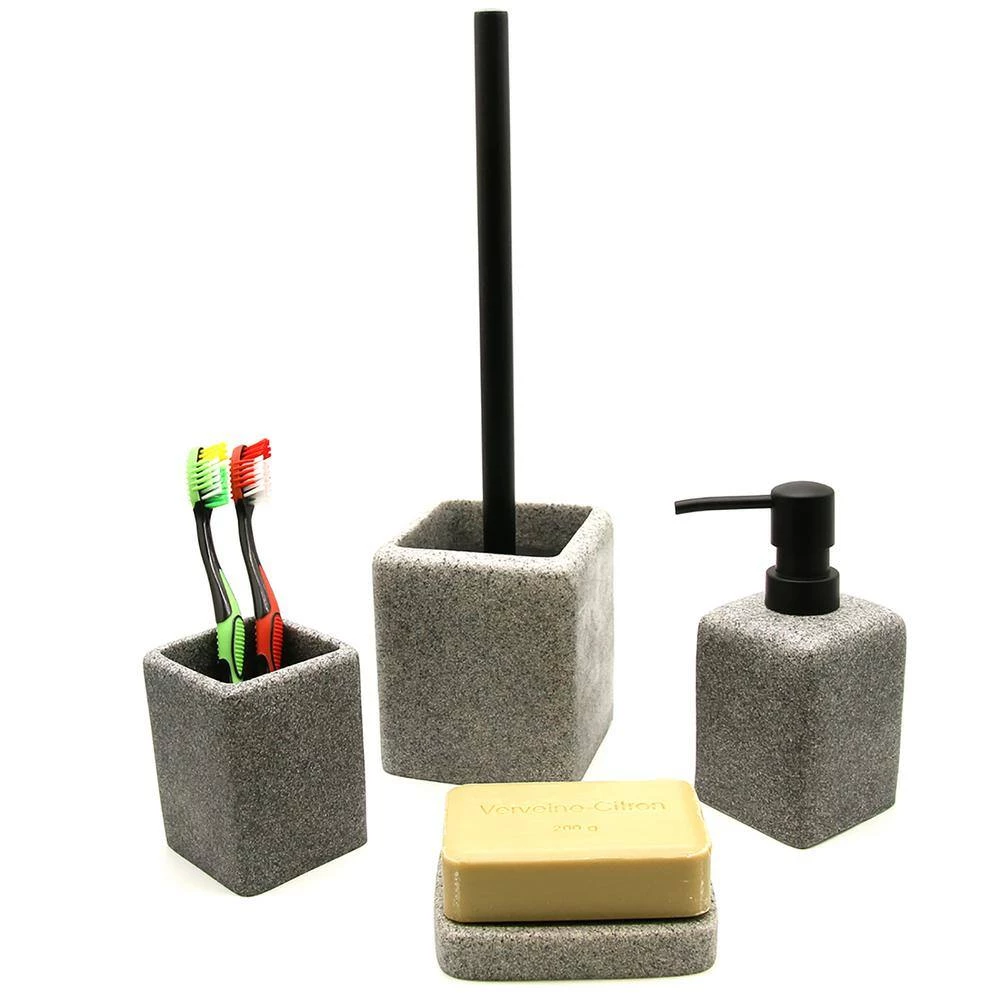 - Complete your bathroom countertops with those accessories featuring a tumbler, a soap dispenser, a toilet brush with holder and a soap dish cup