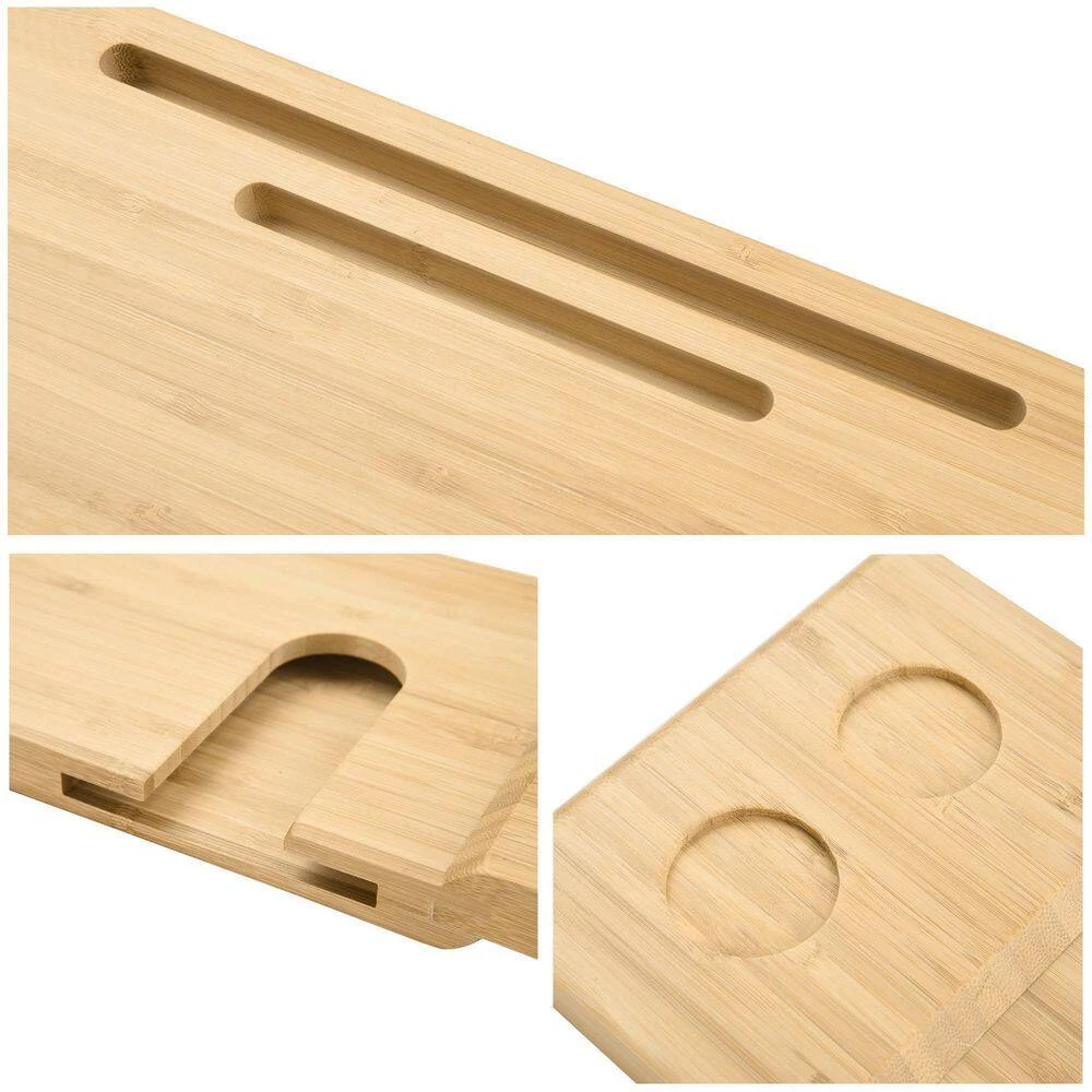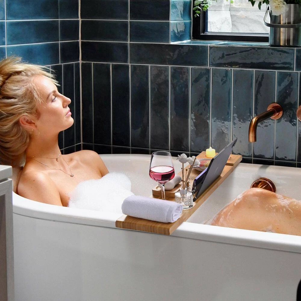 It must be a great joy to have this bamboo tray for a relaxing bathing experience. Bathtub caddy tray is compatible for bathtubs with width from 19-1/2 in. to 27-9/16 in., keeping your phone, tablet, aromatic candle, wine glass and bath accessories in place and within an arm’s reach during bath time, ideal for improving your bath experience to release pressure and get ultimate relaxation.Sturdy bamboo tray for ensuring durability, eco-friendly and odorless design enables you to immerse into a natural and healthy life style.