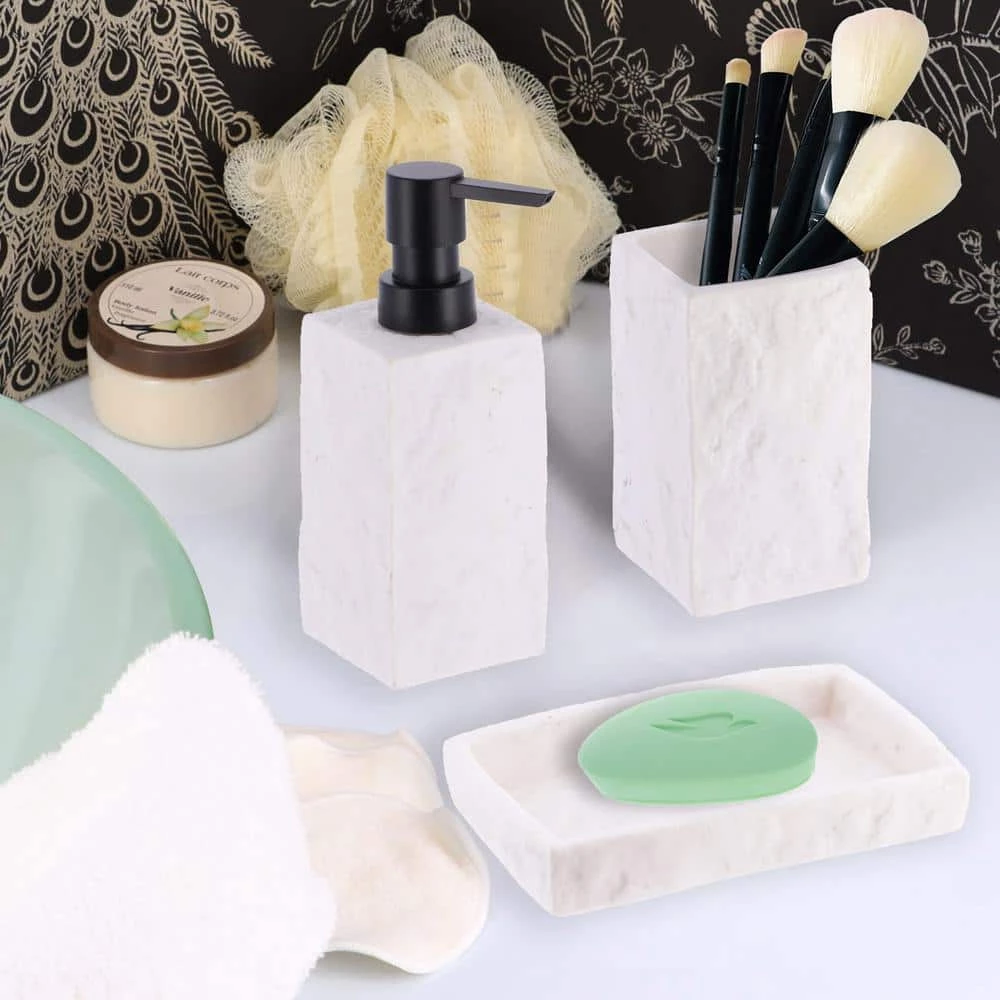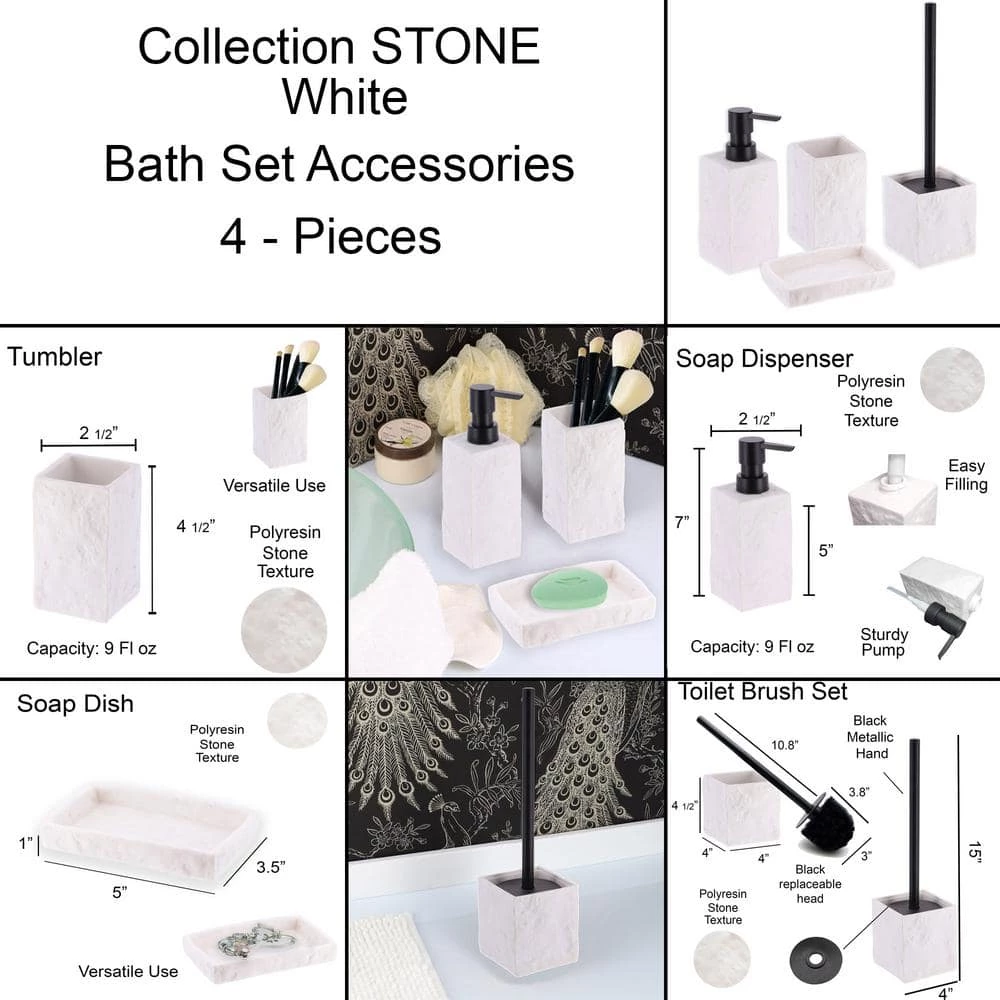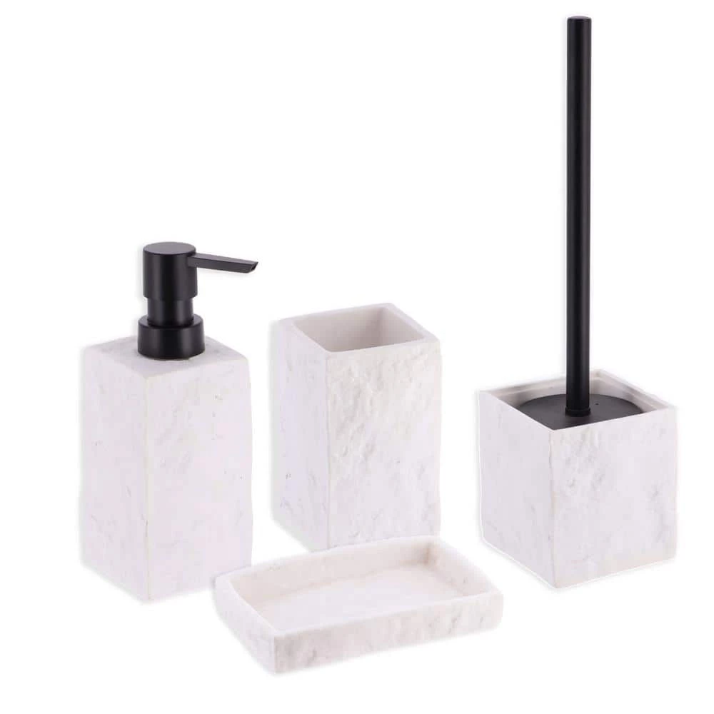 - Enjoy the complete collection and give your bathroom a new fresh with our white Stone bathroom accessory set 4-pieces
